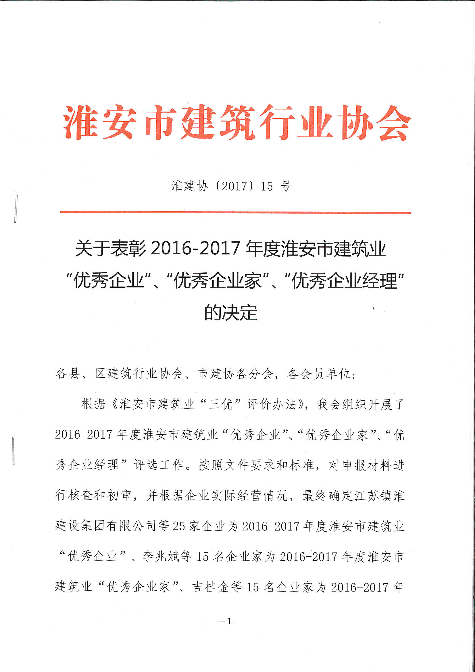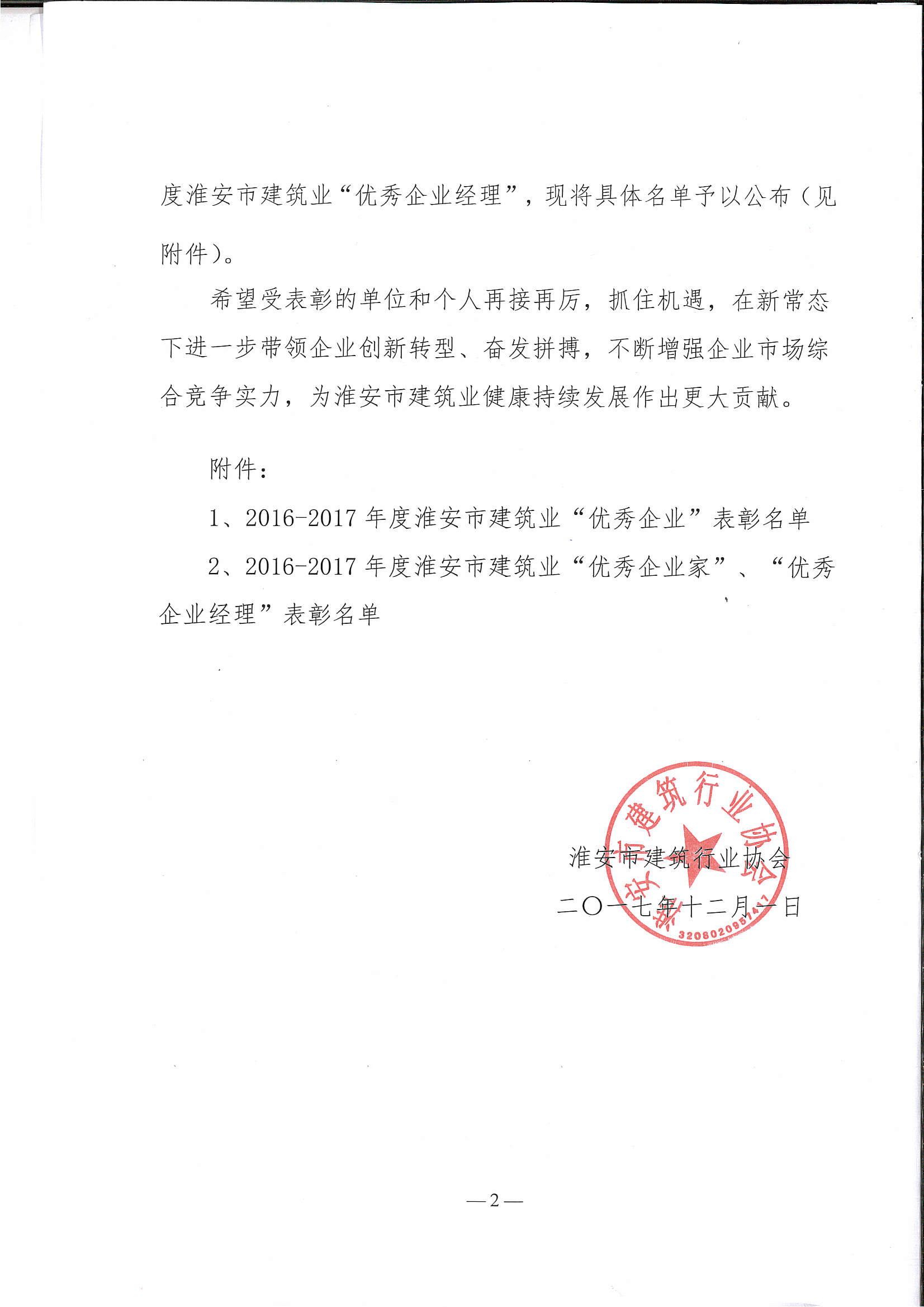 我公司荣获“2016-2017年度淮安市建筑业优秀企业”称号