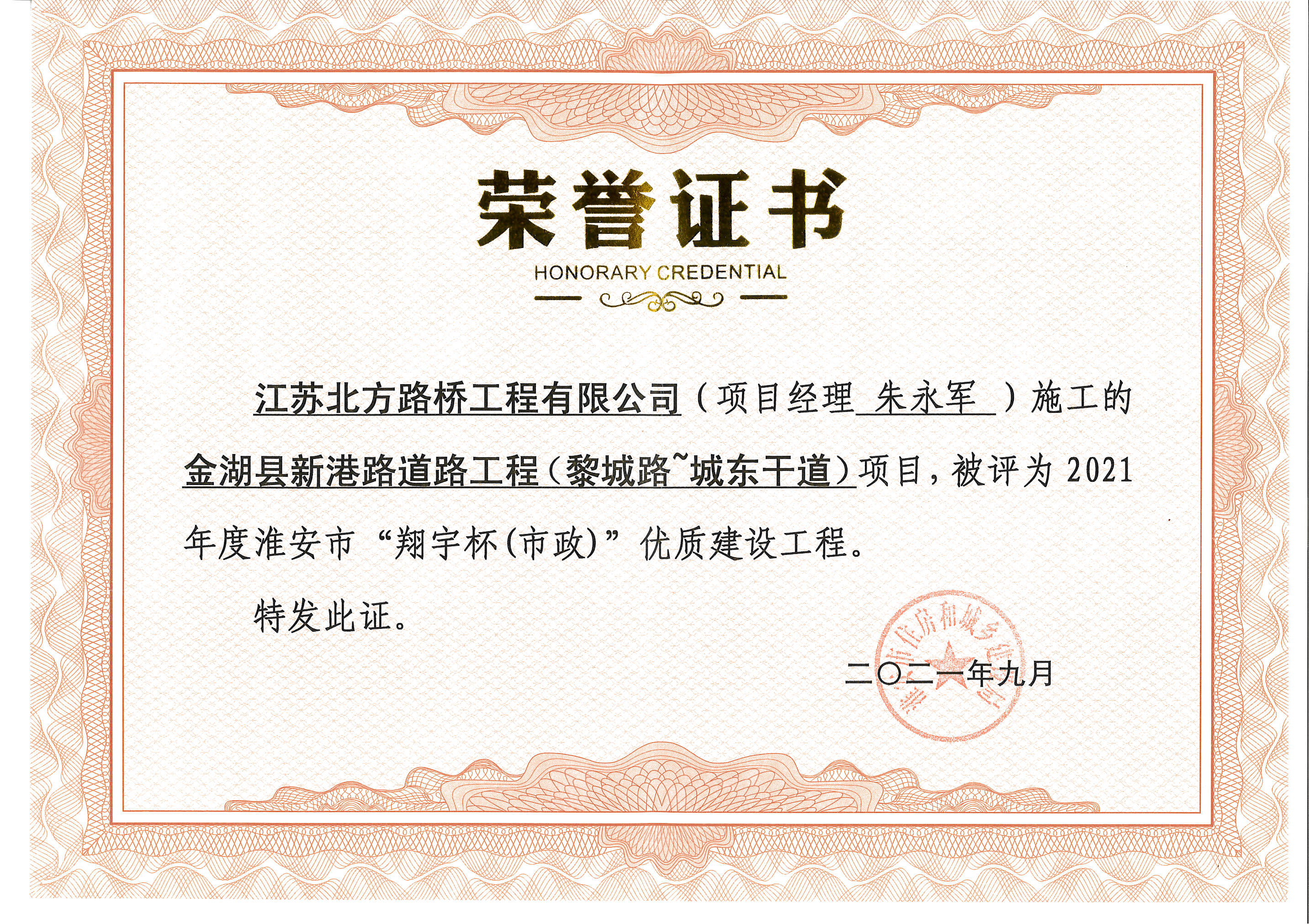 米兰app登录入口施工的金湖县新港路道路工程(黎城路--城东干道)项目,项目经理:朱永军。在2021年9月被淮安市住房和城乡建设局评为2021年度淮安市“翔宇杯(市政)优质建设工程。