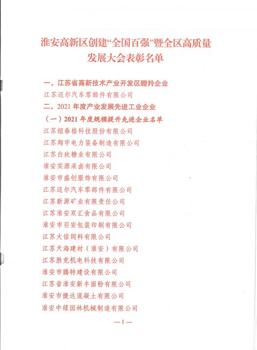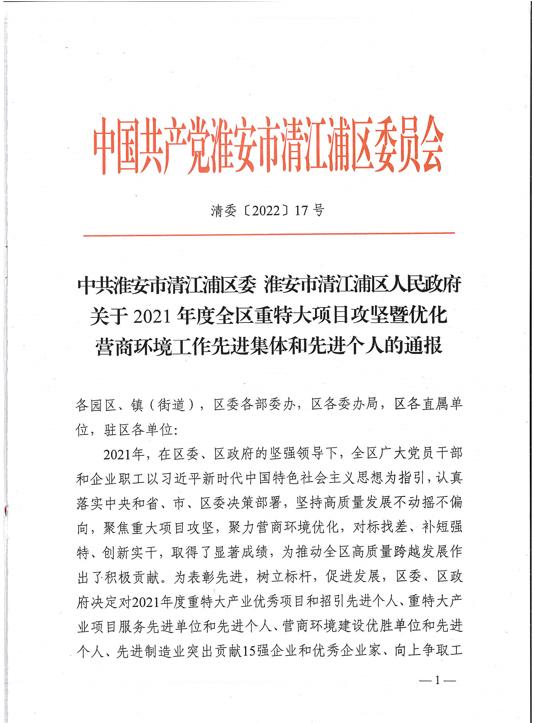 淮安加实新型建材科技有限公司被中共淮阴区委、淮阴区人民政府授予“2021年度规模提升先进企业”光荣称号。