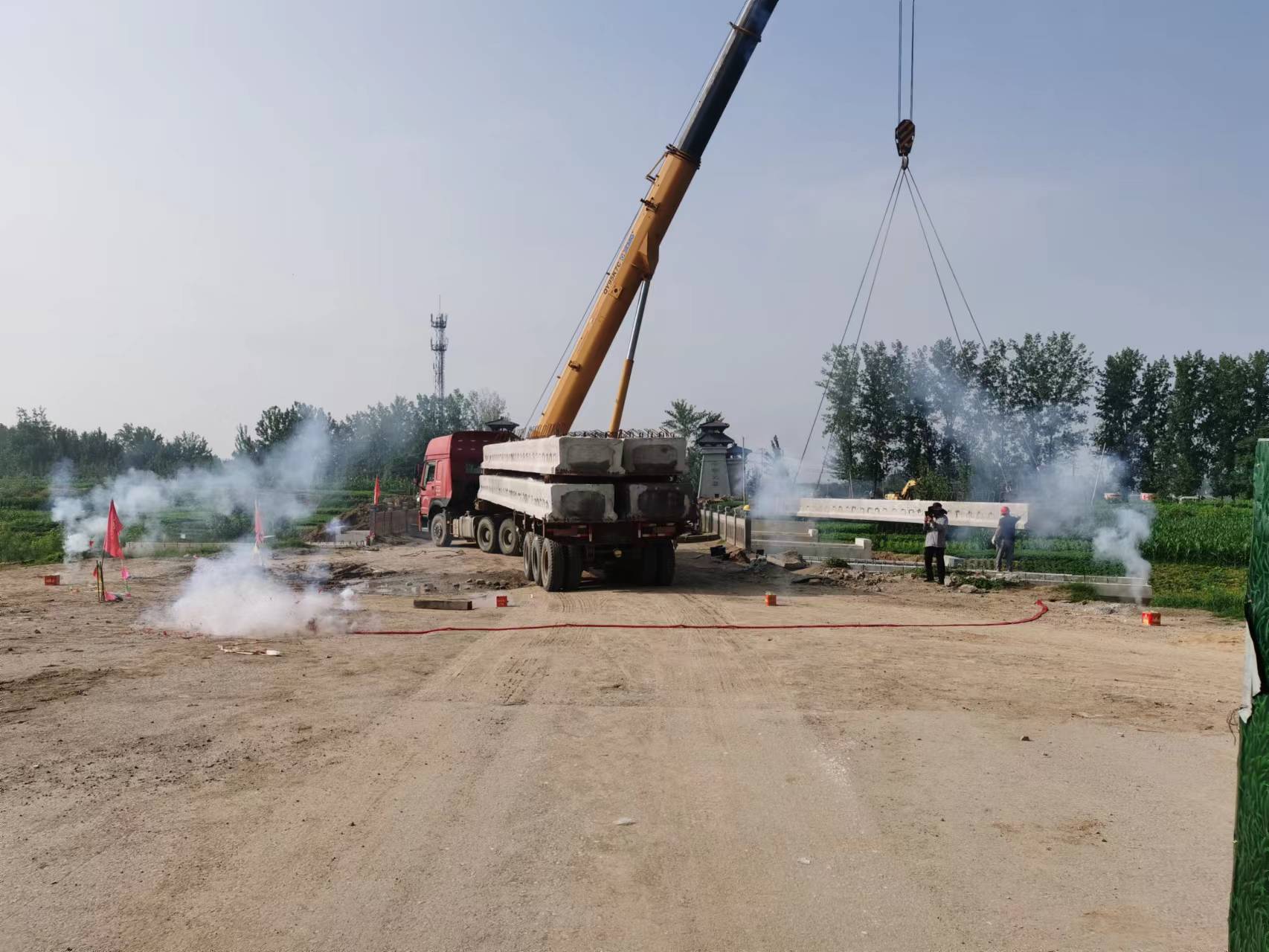 7月14日,山东菏鄄路小留南桥吊装桥板作业现场。