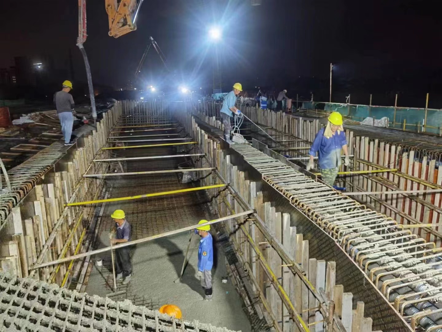 7月26日,江阴花北路桥箱梁底腹板砼浇筑作业现场。
