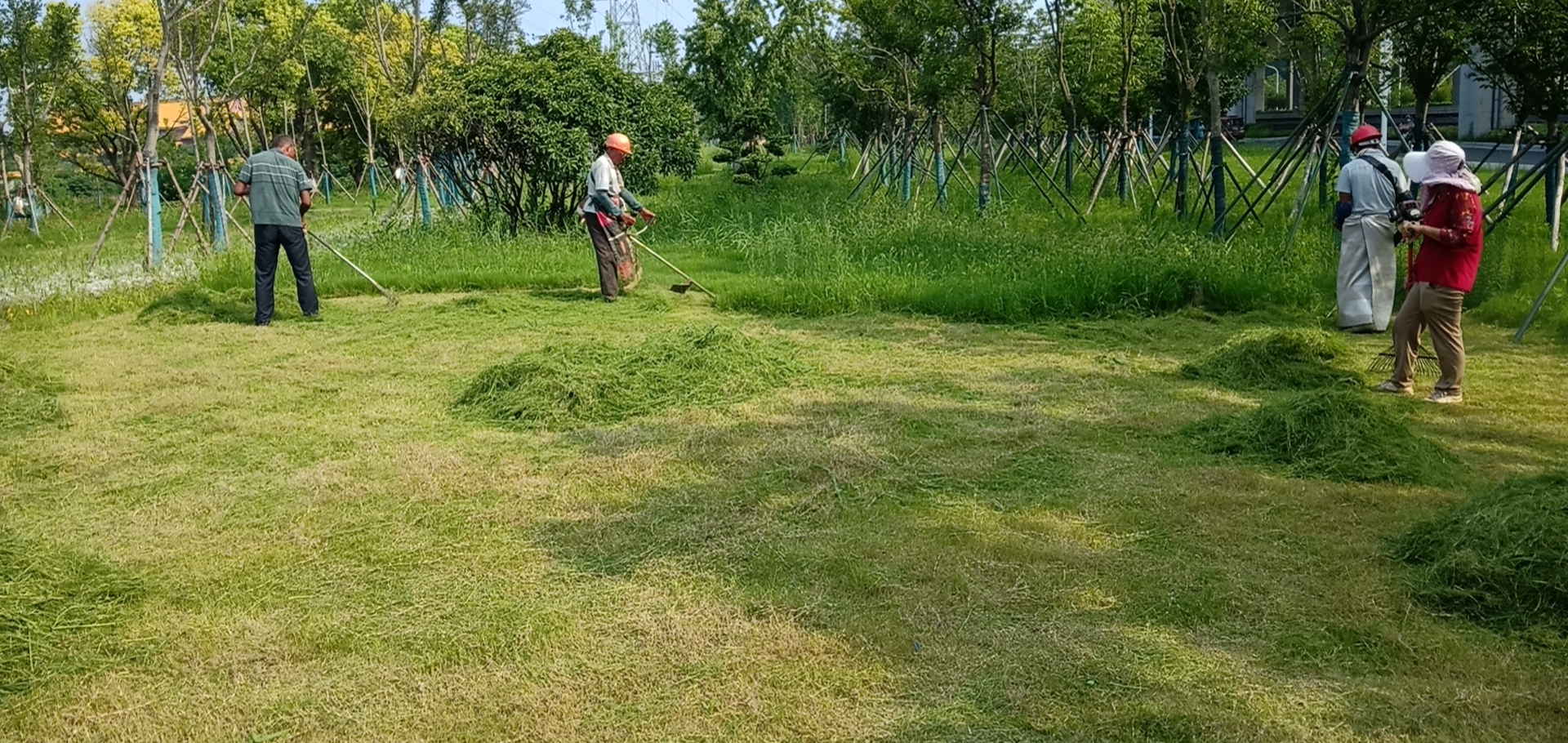 7月12日,荷泽市曹县林木小镇项目草坪修剪作业现场。