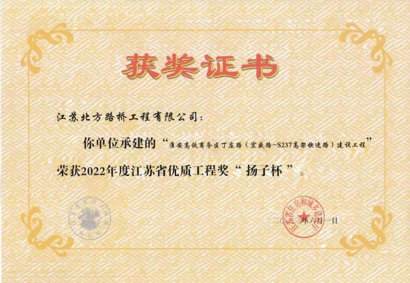 近日,江苏省住房和城乡建设厅公布了2022年度江苏省优质工程奖“扬子杯”获奖项目名单 ,2022年扬子杯共评出486个项目,其中市政工程类共46个项目获奖,我公司承建的淮安高铁商务区丁庄路(宏盛路--S237高架快速路)建设工程获此殊荣。