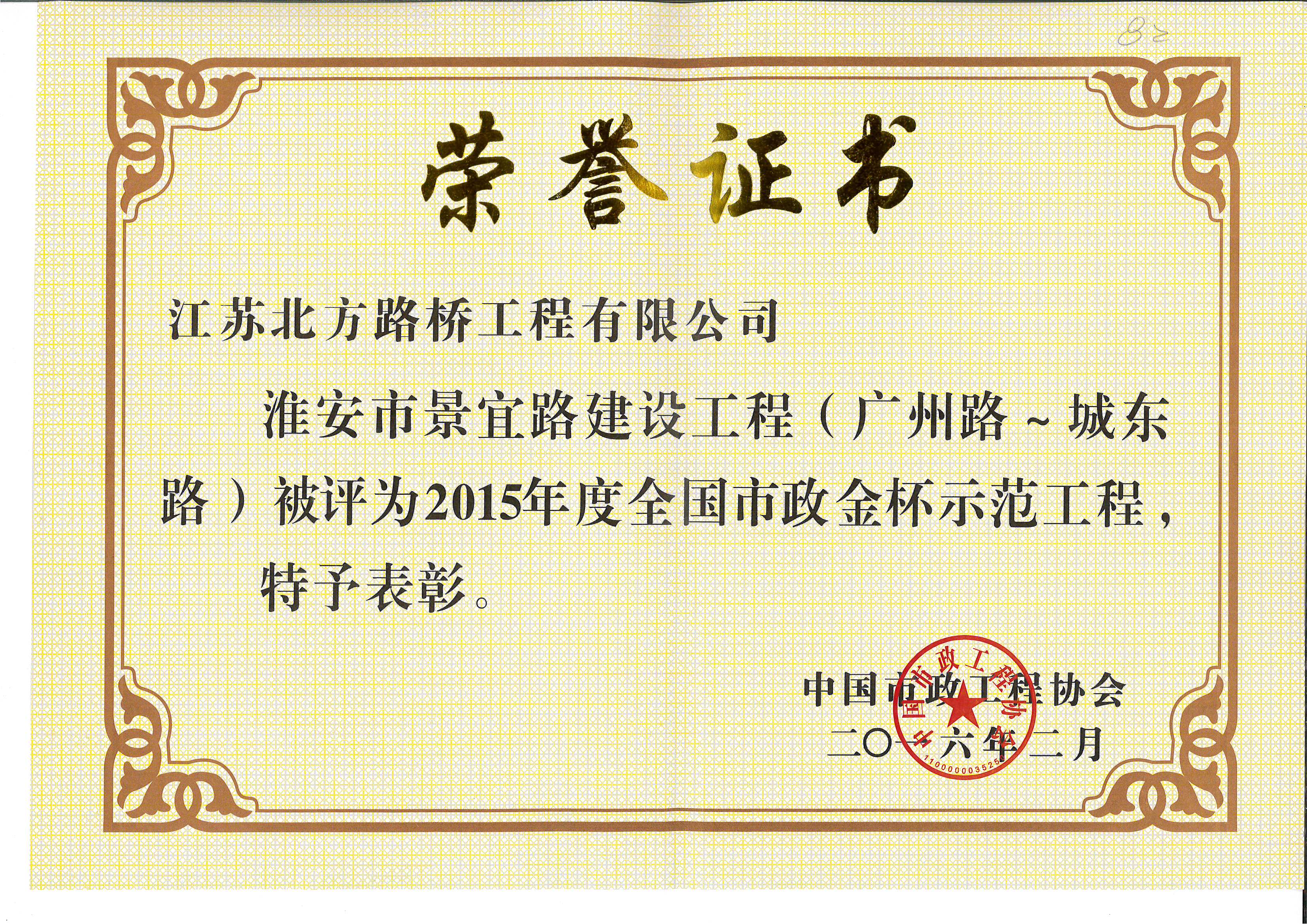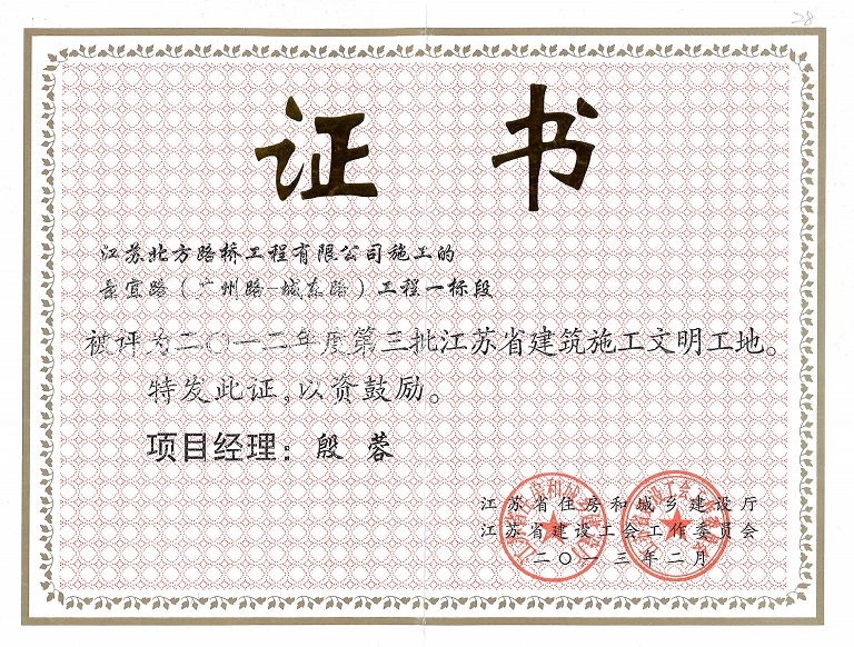 淮安市景宜路建设工程(广州路—城东路)荣获2012年度第三批江苏省建筑施工文明工地;荣获2015年度全国市政金杯示范工程!!!